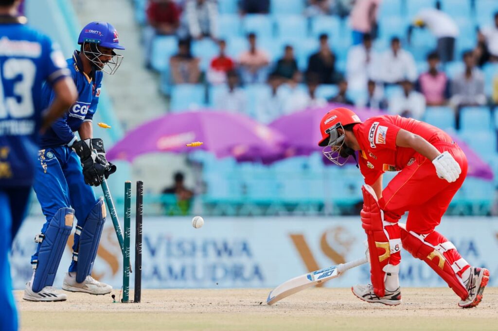 मेरठ मैवरिक्स – 41/2, 8 ओवर (स्वस्तिक चिकारा 29*; आक़िब ख़ान 1/5, विनीत पंवार 1/11)