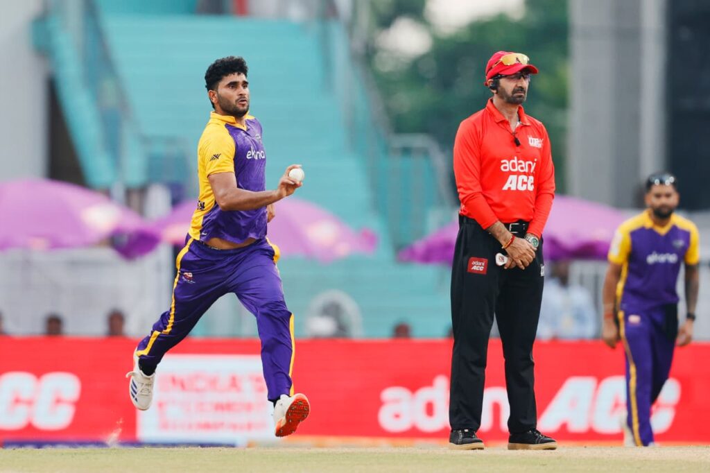 लेकिन कानपुर के स्पिनर शुभम मिश्रा और दमनदीप सिंह ने लखनऊ की गति पर लगाम कस दी। मिश्रा ने शुरुआती महंगे ओवर के बाद शानदार वापसी करते हुए अगले तीन ओवरों में सिर्फ 16 रन दिए, जबकि दमनदीप ने सैफ़ को स्टंपिंग करवा कर बड़ी साझेदारी तोड़ी और कुल 29 रन देकर अपने चार ओवर पूरे किए।